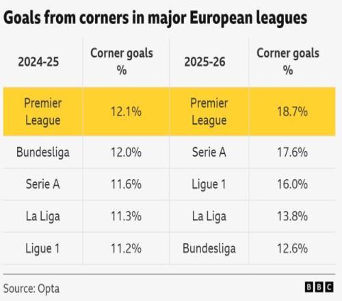 这个趋势不仅存在于英超,五大联赛的角球破门占比都比前一赛季有了提高。英超是从12.1%提升为18.7%,德甲和意甲也有类似的明显涨幅,西甲和法甲的涨幅则低出不少(下表)。