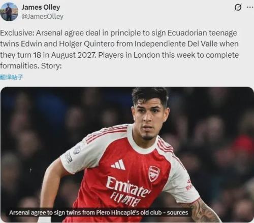 阿森纳900万签厄瓜多尔双胞胎兄弟达协议!枪手双星仍需几周复出