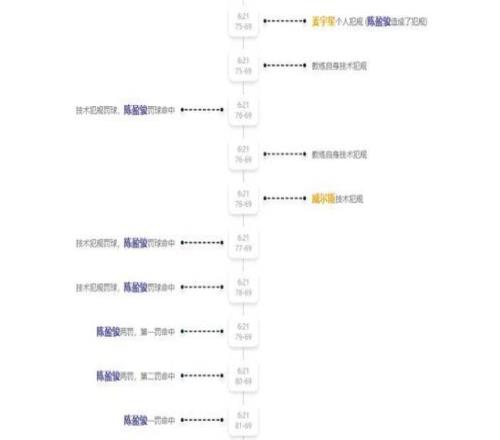 一时间辽宁队被连吹三次技术犯规,再加上之前姜宇星的犯规,北京队获得5次罚球机会。陈盈俊主罚,他先后罚了6个,这明显错了。罚球前比分是75-69,罚后变成81-69,后来裁判终于意识到了错误,又给扣了一分。