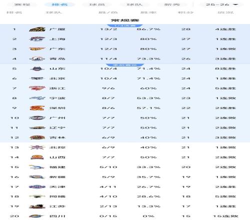 上一轮,广东队大胜同曦队,取得一波3连胜,排名第二,上海队上一轮爆冷输给深圳队,一波9连胜遭到终结,也是让出榜首位置,掉到第三。